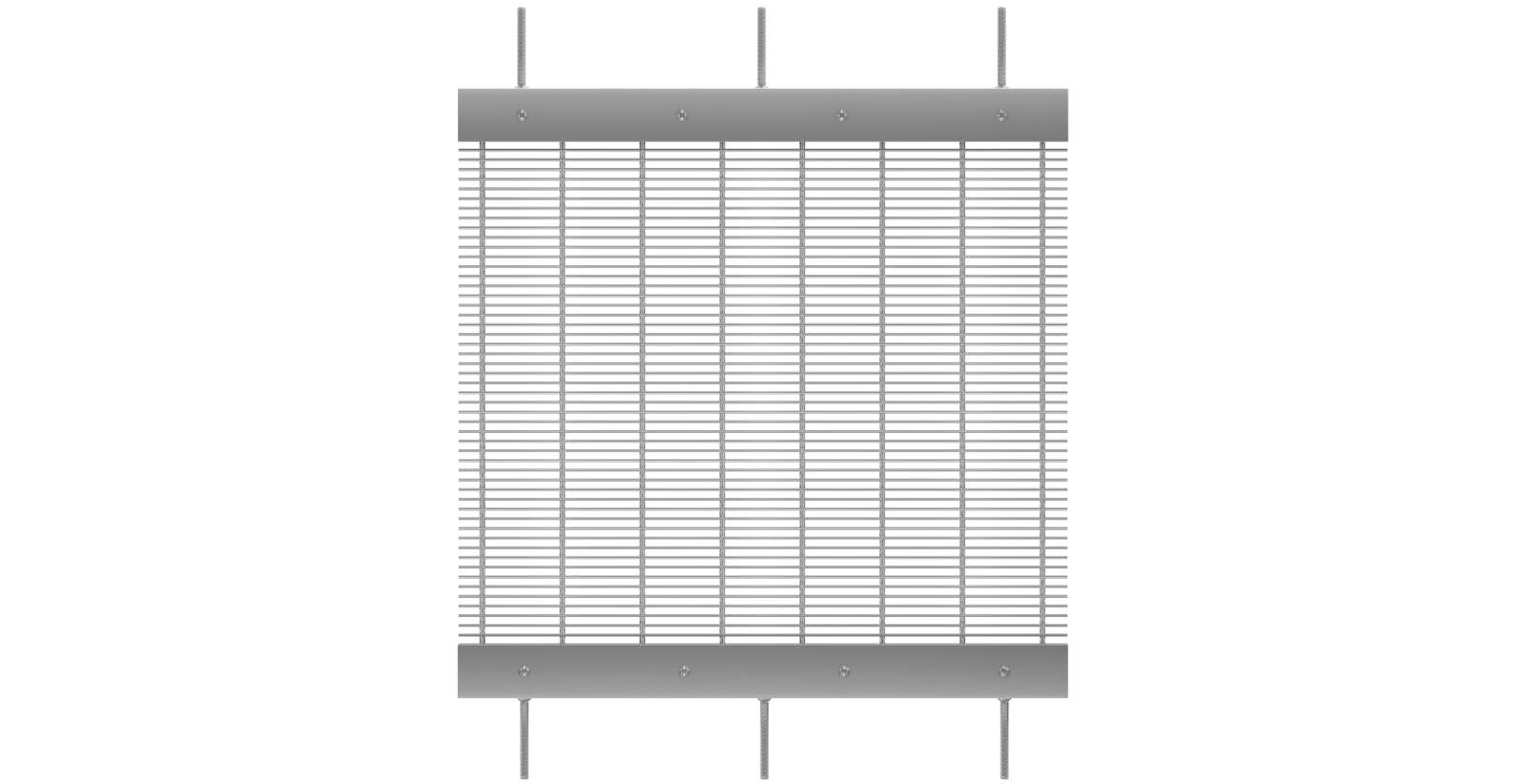The fabric is clamped by the flat and angled bars with a threaded rod welded to the angle bar for tensioning via turnbuckles or nuts. Other bar profiles may be considered based on the desired appearance. This method is frequently used for interior partitioning and multi-level stairwell balustrade partitions.