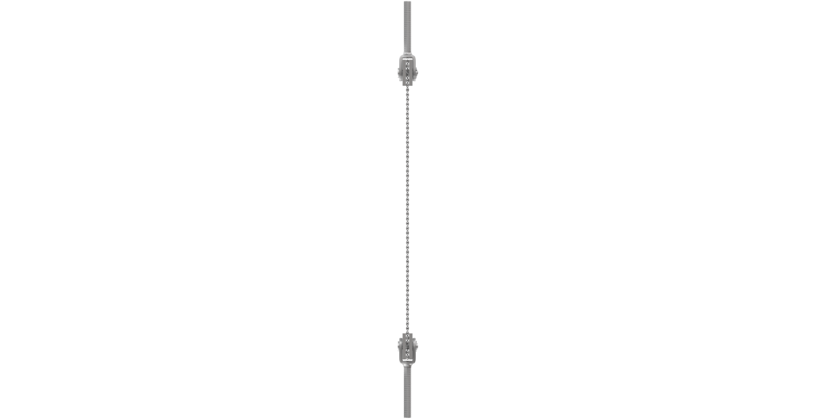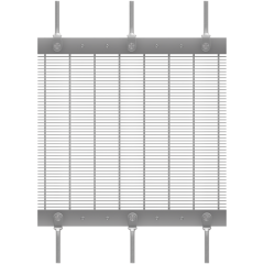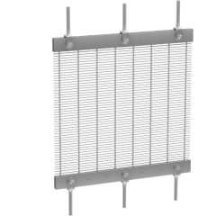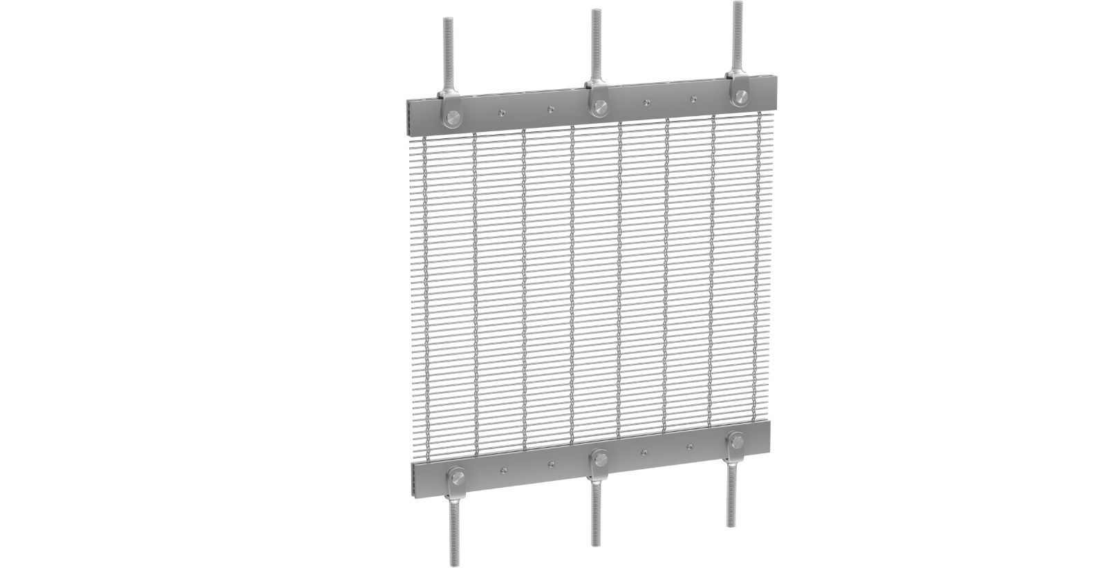 Both ends of the fabric are clamped by flat bars. Clevises with threaded rods are added for tensioning by turnbuckles or nuts. With its clean, finished appearance, this system works well for both rigid and flexible metal fabrics.