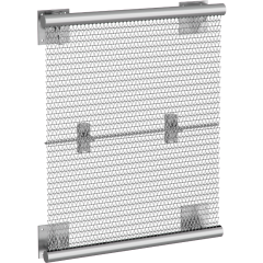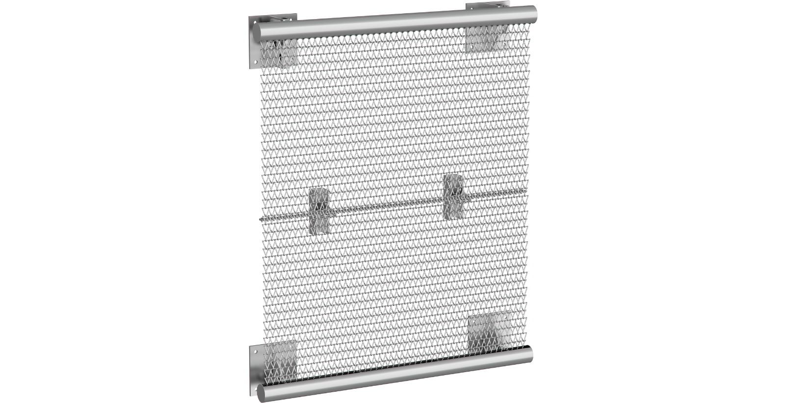 In the StealthLok system, a GKD exclusive attachment method, the metal fabric ends terminate within cylindrical shrouds after passing through a defined envelope. This masks the hardware within the cylinder while a bar permanently secures the fabric. Tensioning is accomplished mechanically from the bottom brackets.